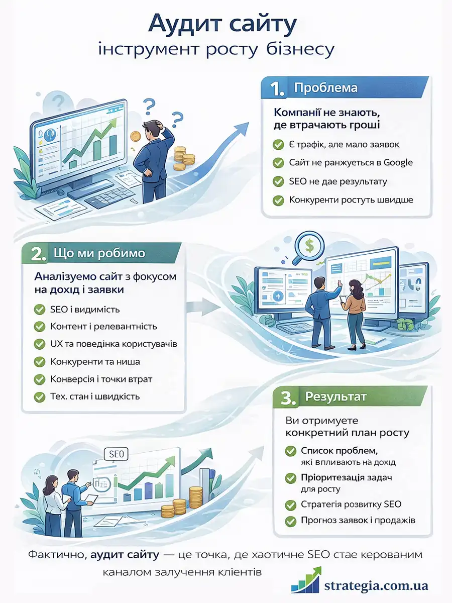 Аудит сайту — це не про технічні чеклісти. Це про бізнес-діагностику. Коли ми дивимось не тільки на помилки, а на причини, чому сайт не генерує дохід.